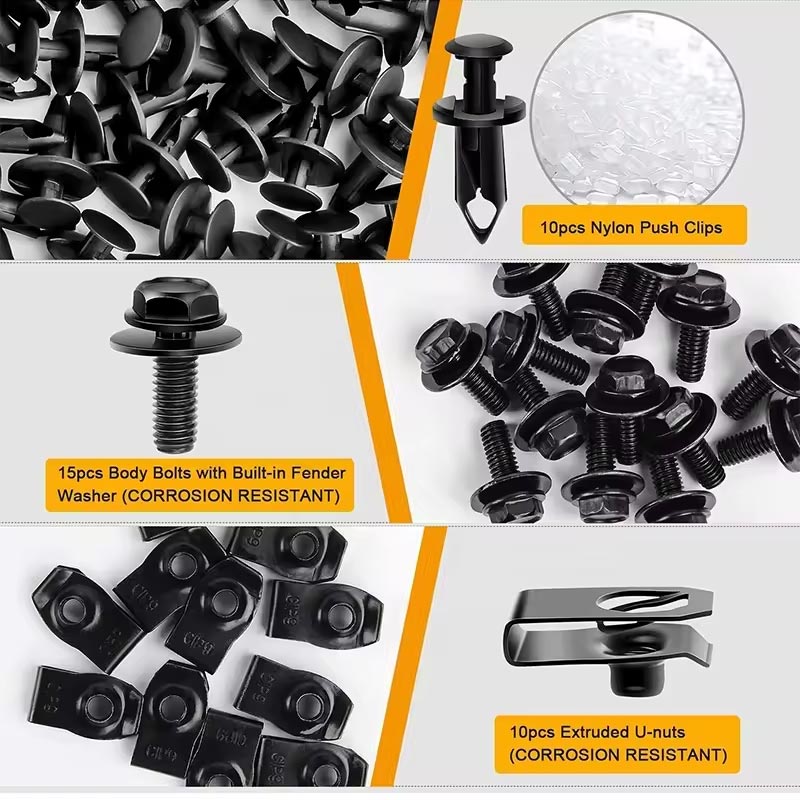 Наш набір кріплень для кузова автомобіля пропонує комплексне рішення для кріплення двигуна під кришками, бризковиками, бамперами та вкладишами крил. Виготовлені з високоякісних матеріалів, ці кріпильні деталі створені, щоб витримувати вимоги щоденного використання та суворих автомобільних умов. Цей універсальний набір необхідний для будь-якої автомобільної майстерні, гарантуючи, що у вас є правильний кріплення для будь-якої роботи.