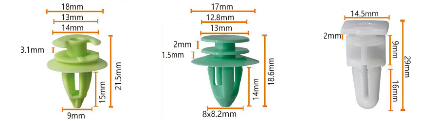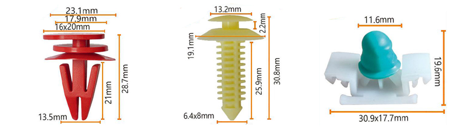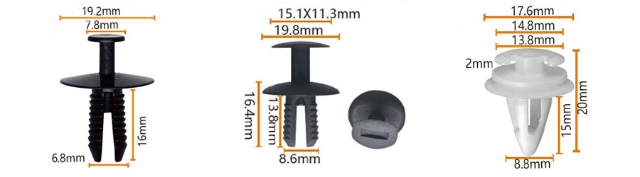 Пластикові кліпи швидкого випуску: використовуються для фіксації панелей кузова, бамперів, підкладки арки коліс тощо. Ці кліпи зазвичай виготовляються з високотемпературних, стійких до високоміцної пластмас і розроблені з функцією швидкого випуску, що робить його легким для ремонту або заміни деталей.