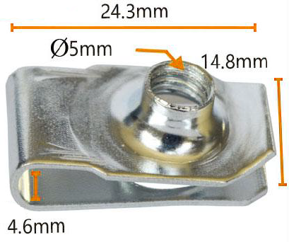 Кріплення може похвалитися точними загальними розмірами, розміром 24,3 мм у ширину та висотою 14,8 мм, забезпечуючи безперебійне пристосування з точками кріплення на вашому автомобілі. Крім того, довжина 4,6 мм, згадана в нижній частині зображення, може стосуватися критичного виміру конкретної частини, ще більше підкреслюючи професіоналізм та точність продукту.